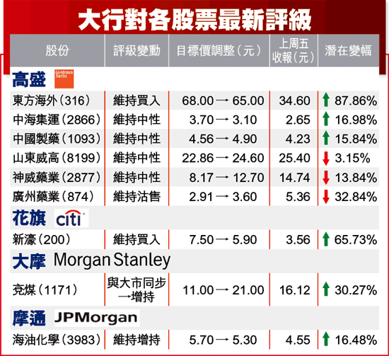 隨着供求因素改善,高盛估計明年航運業整體運費可上升15%至20%,較先前預測的5%至10%,高出10個百分點,並預期業界明年可扭虧為盈。不過,因應國際油價向上推高成本,該行同時將業界明年及後年的平均每股盈利預測,分別調低19%及2%。由於東方海外控制成本得宜,令毛利改善,高盛維持其明年每股賺0.15美元的目標。