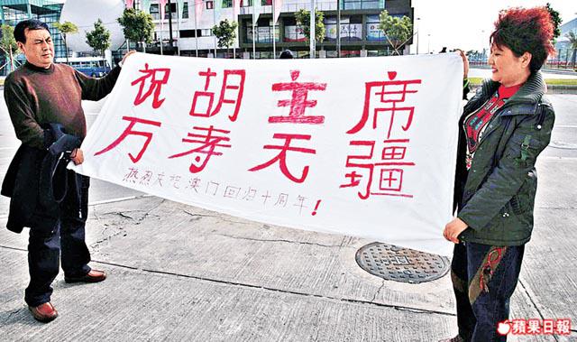 眼見澳門有今日,回族同胞情緒相當高漲,帶頭嘅一位先生話,睇新聞知道胡總嚟咗澳門,心情激動,開心到成晚瞓唔着,凌晨3點心血來潮,於是扯開酒店張床單,用紅色雙頭筆揮筆疾書,寫下「祝胡主席萬壽無疆,熱烈慶祝澳門回歸十周年」嘅橫額,諗住向經過嘅胡總車隊揮舞。至於另一位中年港男就不停向在場記者打聽胡總行蹤,十足胡總粉絲咁款。