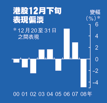 恒指上周五報21175點,1%跌幅足以令港股失守二萬一。統計自2000年以來12月下旬港股表現,共錄得五跌四升成績。值得留意,近四年12月下旬大市變幅動輒超過2%,最多更達5%,反映長假期前港股波動性不減反增。