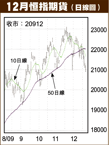 筆者一直用杜拜事件爆發當日期指低位20957為恐慌底,一旦跌穿,大市應確認轉差。本來杜拜事件之後,大市曾作出反彈,士佳變身小好友後繼續看好,但其後無以為繼,大陰燭下跌,小陽燭反彈,逐步向下,近幾日跌勢加劇,昨日終於失守20957。