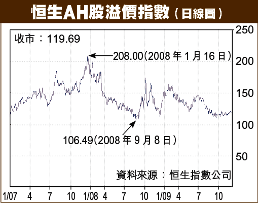 當年,A股的平均價格曾經比H股高足足一倍,現在僅20%。恒生AH股溢價指數在今年年初還有160點,但是,A股市場從今年年中開始調整,至今大半年仍未恢復,導致AH股溢價指數至昨日跌至不足120,即A股平均價比H股高出不足20%。