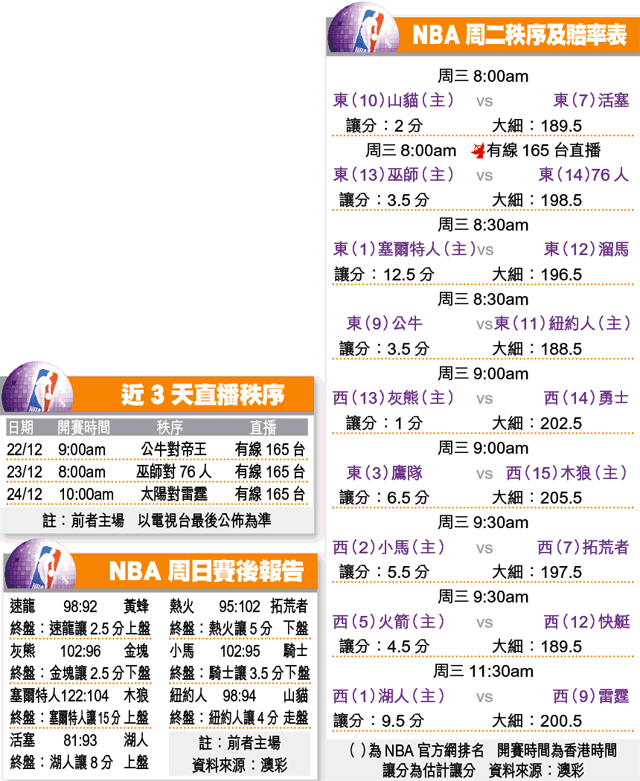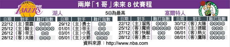 不要忘記,兩軍都是所屬岸區的大熱,亦同要為季後賽的主場優勢而努力,令「1哥」之位更形重要。且看全速前進的綠軍,能否在聖誕賽程後反超前湖人。