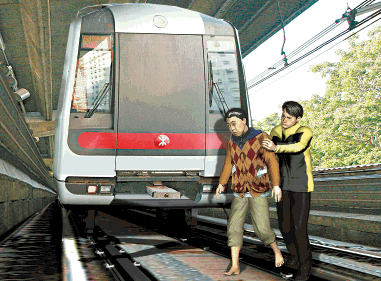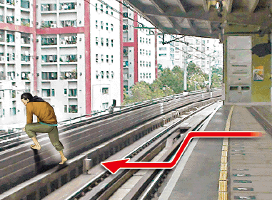 【本報訊】一名有離家出走前科的智障青年,昨晨在繁忙時間逃過港鐵職員耳目,逕自走落港鐵牛頭角站路軌後,危坐離地20米高的路軌旁石壆邊,雙腳半天吊險象環生,駛至的列車擦身而過,幸車長緊急煞停列車,青年幸未被撞傷或墮地,由職員協助返回月台送院檢查,列車服務輕微受阻。 記者周鴻熙