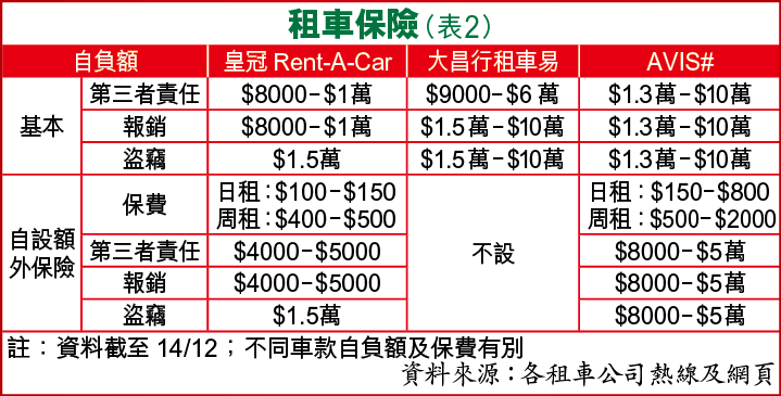 一般租車的租金已包括第三者責任保險、盜竊或報銷汽車費用,AVIS最高自負額等同按金,Rent-A-Car及租車易則視乎不同情況。租車易第三者責任保險自負額,由9000至6萬元,盜竊或報銷自負額,則為1.5萬至10萬元(表2)。