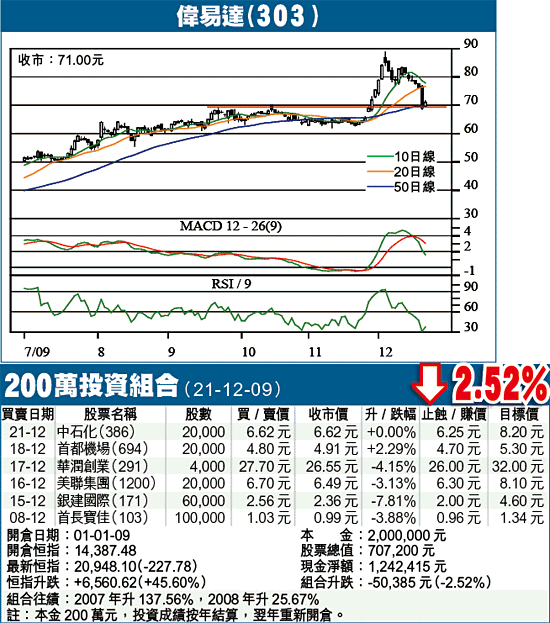 偉易達(303)上月公佈中期佳績,股價一度搶上88.80元,高位回吐壓力甚大,上周五以大陰燭下挫,最低見過68.50元,較高位跌近23%,昨以短陽燭回升,收報71元,形態似是利好的身懷六甲,大市雖淡,仍可作為博反彈之選。