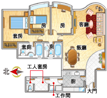 室內裝修講究,歐陸式的設計更添華麗感,亦充份利用高樓底的優勢,建做大型假天花、選用高身水晶吊燈,套房更附設12呎高巨型衣櫃,罕見度非一般。
