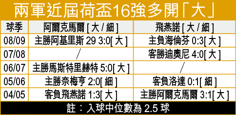 飛燕諾讓平/半,宜博下盤。另外,由於兩軍近屆於荷盃16強常開「大」(見附表),且踢法同樣主動,加上飛燕諾近6次迎AZ有4次開「大」,今役入球「大」有1.8倍,亦宜兼顧。