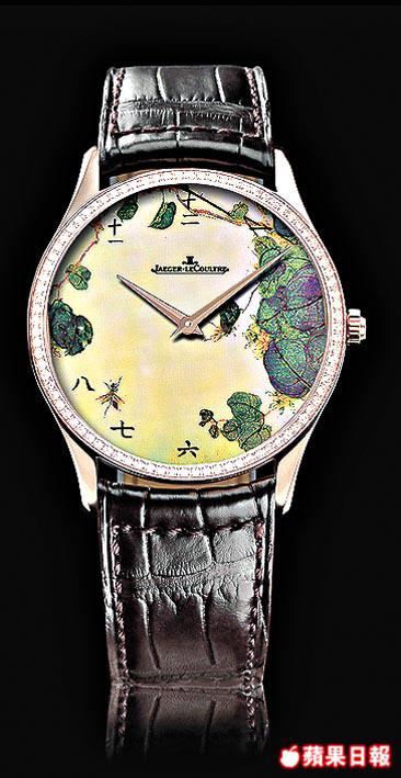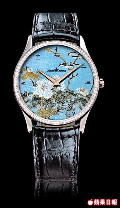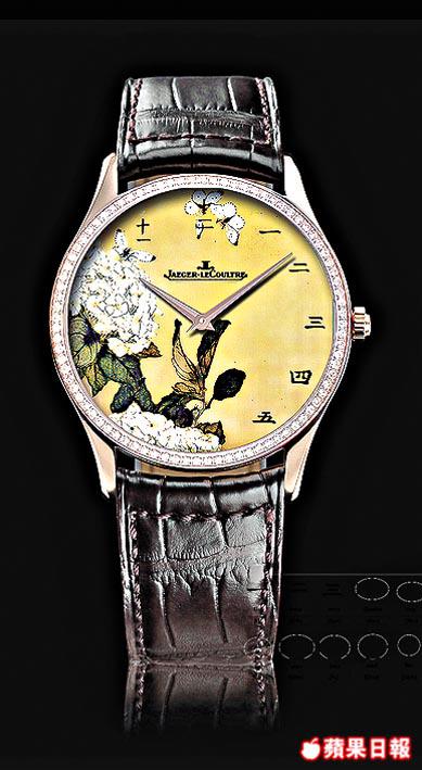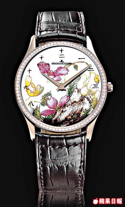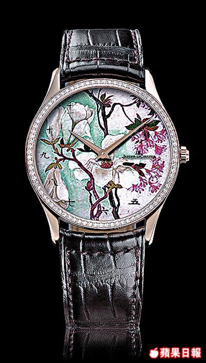 以往JLC曾推出過不少琺瑯彩精品,但以西洋畫為主,中國風格的,也有曾因應要求特製過毛澤東、孫中山肖像的琺瑯彩錶。今次特別為亞洲錶迷而設的清花系列,一套8款,限量25套,以花鳥為主題,典雅的18K玫瑰金鑲嵌鑽石錶圈,錶面時刻除採用中國字,更特別改在玻璃底而不是慣常的錶面,以保留國畫的構圖和美感。