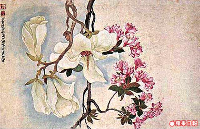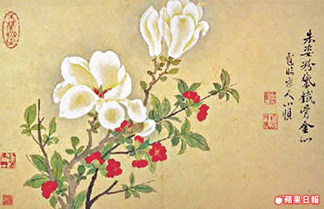這枚腕錶上,表面仿繪了惲壽平大師的木蘭花卉圖,淺青黃底伴以紅白花朵,色彩佈局簡潔清雅,無框線的筆法,凸顯大師「沒骨法」的特色。