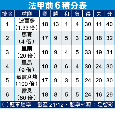 客軍今仗陣容仍然完整,除施安尼、軒歷基等長期傷兵外,可強陣。而且波爾多在近季歇冬最後一仗聯賽都表現可人,近3季都勝出,包括上季作客以4:3擊敗摩納哥,開出「客其他」波膽。