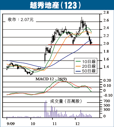 越秀地產(123)升銳退速,短短8個交易日,由高位2.72元急跌到2元水平,跌幅26%,剛好去番11月底的起步位,噚日跟市回升,收2.07元,升4仙。走勢形成身懷六甲,今日若再升,則反彈之勢確認,初步可上番2.30元水平。