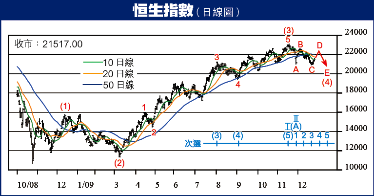 前三周的下跌可視為中浪(4)小浪A調整,低位為11月27日的21002(H指12389)。中浪(4)小浪B反彈高位為12月3日的22594(H指13513);12月21日低位20933(H指12164)為中浪(4)小浪C低位。目前為中浪(4)小浪D反彈,阻力為50日線恒指22000(H指13000)。整個中浪(4)的調整低位目標區仍為恒指19500/21000(H指11200/12300)之間。
