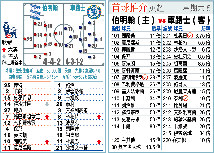 進入聖誕節快車期,榜首的車路士首仗先要作客伯明翰;以後者自港人班主楊家誠入主後越踢越好,近9場不敗,車仔要贏兩球有難度,博他們在聖安德魯斯球場小勝而回,吼「讓球主客和」[-1]的「和局」。
