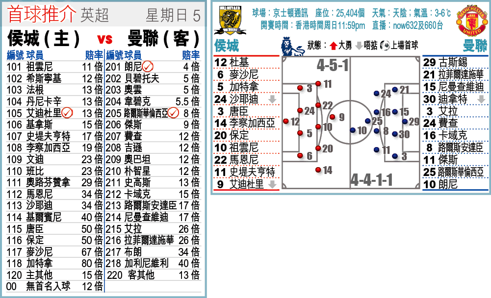 周日英超,聯賽榜3支前列球隊均出擊,阿士東維拉到訪倫敦遇阿仙奴;以維拉近年在阿聯酋球場都搶分成功,加上兵工廠傷兵仍多,「客勝」值博。曼聯作客侯城,受傷後的紅魔必渴望求勝,打「虎」格,同取「客勝」。