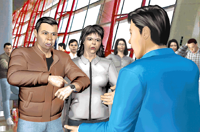 孫又說:「當時周生都喺度,冇嘢發生。」但6分鐘後,周先生突然走近問他:「你公司幾多號電話?」孫即告訴他並問:「乜事呀?」周先生說:「我要投訴你,你非禮我老婆,你頭先摸佢,由手臂摸到膊頭。」孫謂他即時作出否認,並向周先生和周太表示:「如果你有乜誤會,我可以鞠躬道歉。」但周先生堅持報警,並用普通話及廣東話大聲叫囂,表示要取回行李。
