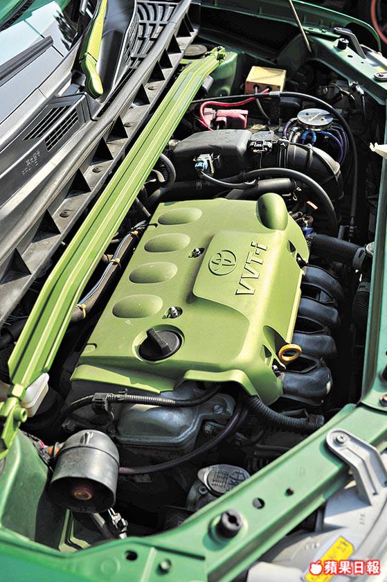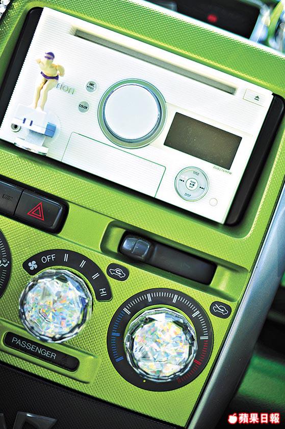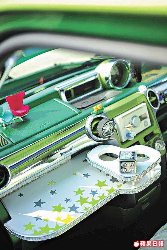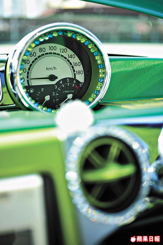 內櫳一樣貫徹「青bB」格局,白底綠邊座椅套,齋睇都覺勁舒服。至於錶板,音響格外殼都全屬青綠配搭,最搞鬼係車身內櫳及車門板全部噴上青綠色。不過別以為清一色嘅綠就毫無配搭可言,事關運用巧妙嘅水晶擺設,便突出整個顏色佈局。青綠色咕車頂中間配置一頂水晶燈,錶板上圍上水晶粒,倒後鏡有水晶吊飾,置身其中,猶如幻影世界。可能車主認為抱住要玩就要玩得徹底嘅想法,竟然連引擎、頂Bar等都噴成青綠色,不得不回敬一句:「使唔使咁誇張呀!」