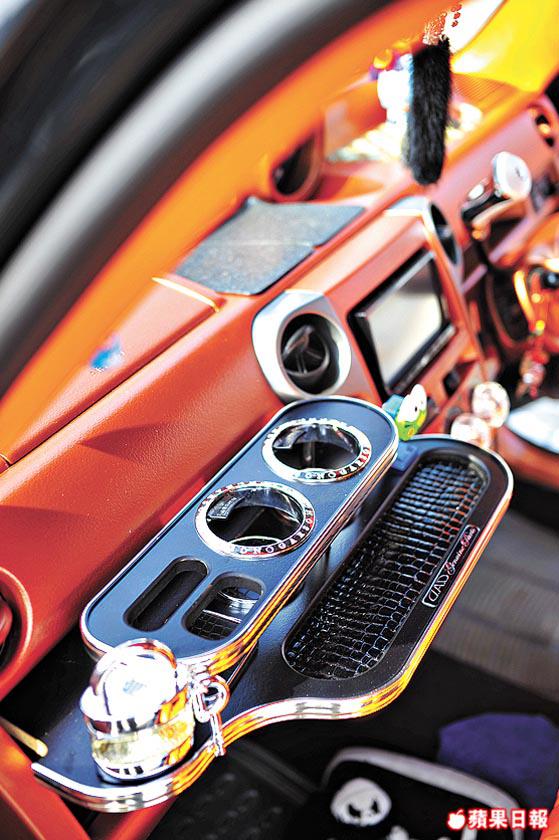 最搶眼位要算司機位,別出心裁嘅白色軚盤配橙色錶板位置,效果相當唔錯,亦十足個人風格,難得車主連按扭都照顧周到,全部換上水晶。要有舒適屋企Feel,梳化椅套唔少得之外,仲有一張小小嘅茶几,加埋bB寬敞嘅內櫳,真係喺度瞓番半日都好嘆。