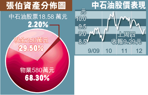 資產總值:現金250萬元、2個已供滿物業市值580萬元、10手中石油(857)市值18.58萬元