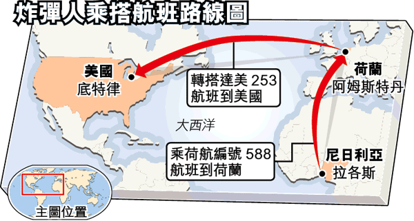 官員又透露,疑犯叫穆塔拉布(UmarFaroukAbdulMutallab),23歲,在英國倫敦大學學院讀工程系,倫敦警方昨日搜查了多處與他有關的地點,尋找相關證據。當局相信他先在尼日利亞首都拉各斯(Lagos)坐荷蘭航空公司編號588航機到阿姆斯特丹,再轉機赴底特律。