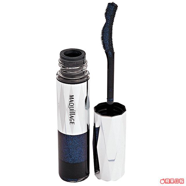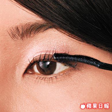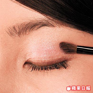 灰藍色眼影由眼底放射式推開,再塗湖水藍眼影於眼蓋上,為增強立體感塗上白色眼影做陰影,下眼線畫上深藍色眼線膏,眼頭位置塗灰銀色眼影拉大眼形。記得選用閃金色的增長睫毛液,夠晒Sparkling。