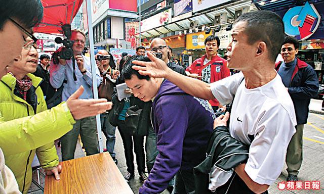 任職扎鐵工人的周先生,昨日途經旺角活動現場,為表達對現時政改方案的不滿,一度與同場收集簽名的工聯會成員理論,質疑政府現時的區議會方案,理論期間突然遭簽名活動中的「總指揮」從後推開,雙方並一度發生口角。