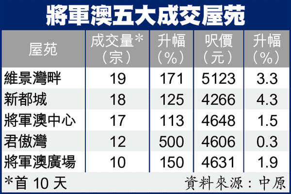 中原地產助理區域營業董事李玉祥表示,市區樓價越來越貴,享港鐵之便兼樓價相對低的將軍澳物業,頓成買家追落後目標。加上區內新盤領峯近沽清,購買力相繼回流二手市場,推動成交。