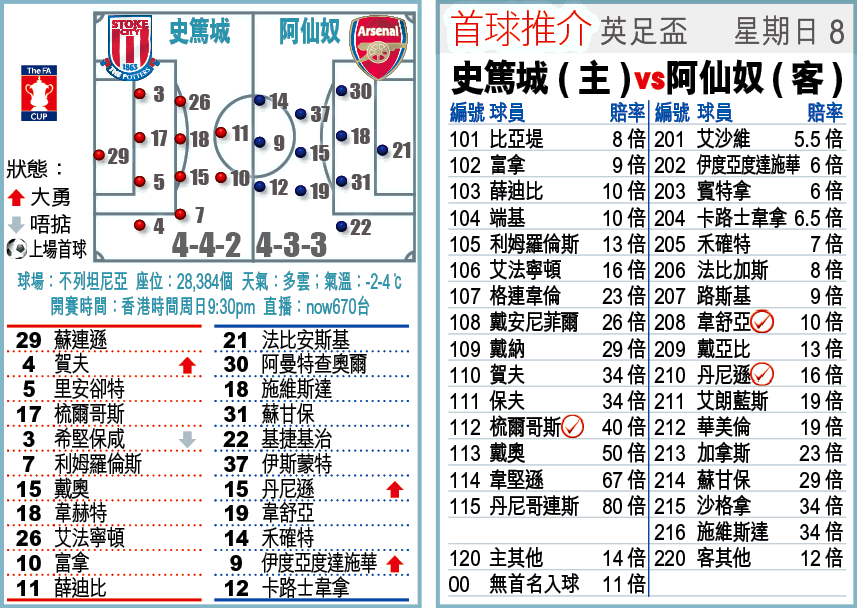 阿仙奴在本土盃賽不會遣強陣,已不是甚麼意外的事,但就算夾雜部份副選出戰,整體實力依然沒大幅下降,周日英足盃第4圈到訪史篤城,信他們可勝晉級之餘,更開出[-1]「客勝」。(球賽編號:星期日8;now670台今日9:30pm直播)戰鬥員A