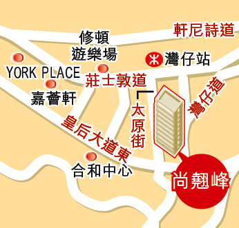 仔道及皇后大道東兩旁,基座為灣仔街市,毗鄰第三級古蹟的舊灣仔街市大樓。利嘉閣地產中半山區域經理區振輝表示,由於嘉薈軒、YORKPLACE及尚翹峰配套設施、環境及交通相近,睇樓時都會一同作比較,大多數置業者都會以實用率、管理費及景觀作考慮。以不計窗台的實用率計,嘉薈軒實用率介乎73至78%,YORKPLACE實用率約68至72%,尚翹峰實用率達75至79%。