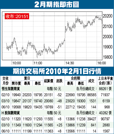 期指早市沽壓持續,一度跌破上周低位19871,低見19795,但未有觸發進一步拋售,反而低位漸見承接,午市展開反彈,以20151收市,跌幅收窄至52點,轉低水92點。