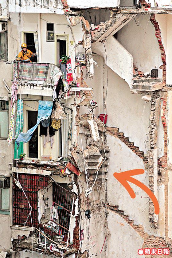 馬頭圍道塌樓變成廢墟,隔鄰唐樓也出現傾斜,剩下的頹垣敗瓦裏,隱約見到懸在半空的樓梯,垂在半空有鋼筋相連,並未完全粉碎。香港樓宇多以樓梯及升降機附近的柱,作為整座大廈的主力柱,劉志宏:「萬一塌樓,第一時間當然離開大廈,絕不能躲在屋內,屋內任何角落都不安全,要盡快跑樓梯逃走,因為樓梯是最堅固部份,不會即時粉碎,就算真的倒塌,倒塌速度也是最慢,另外,貼近升降機的牆都是主力牆,逃生時貼牆走,避免在走廊中心走,也可減低受傷機會。」