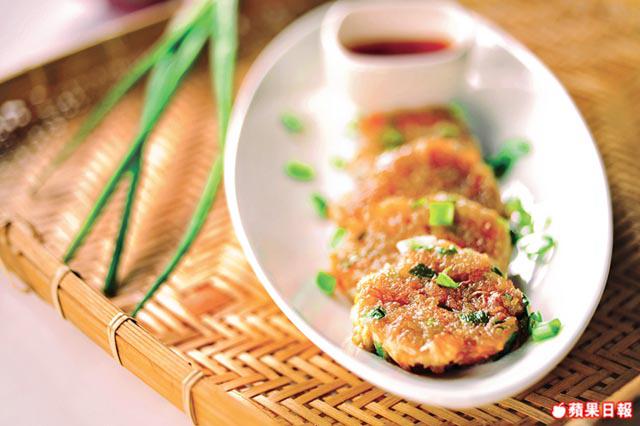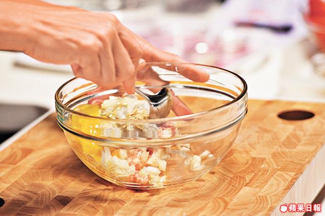 1.蝦肉剁碎,與碎豬肉、洋葱碎、魚露、白胡椒粉、鹽及雞蛋拌勻。蘿蔔苗去葉再刨皮。