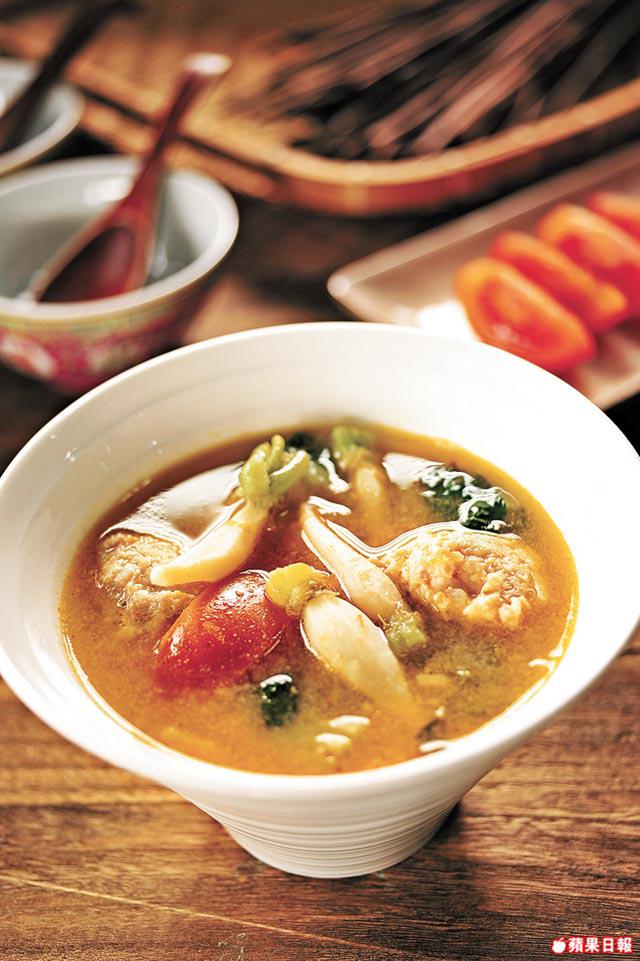 肉丸料:蝦肉110克、碎豬肉110克、白胡椒粉1/2茶匙、鹽1/2茶匙、魚露1茶匙、雞蛋1隻、洋葱碎20克 湯料:洋葱碎50克、蒜頭1粒(切碎)、辣椒碎1茶匙、魚露3湯匙、番茄4個(切件)、有機蘿蔔苗120克、雞湯500毫升、水250毫升、蝦醬1茶匙、鹽1/4茶匙、白菜80克(切碎)、青檸汁1湯匙