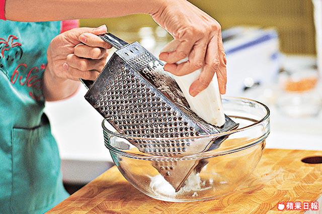 每個蘿蔔的水份都不同,刨絲後必要揸乾水份,才加入其他材料拌勻。