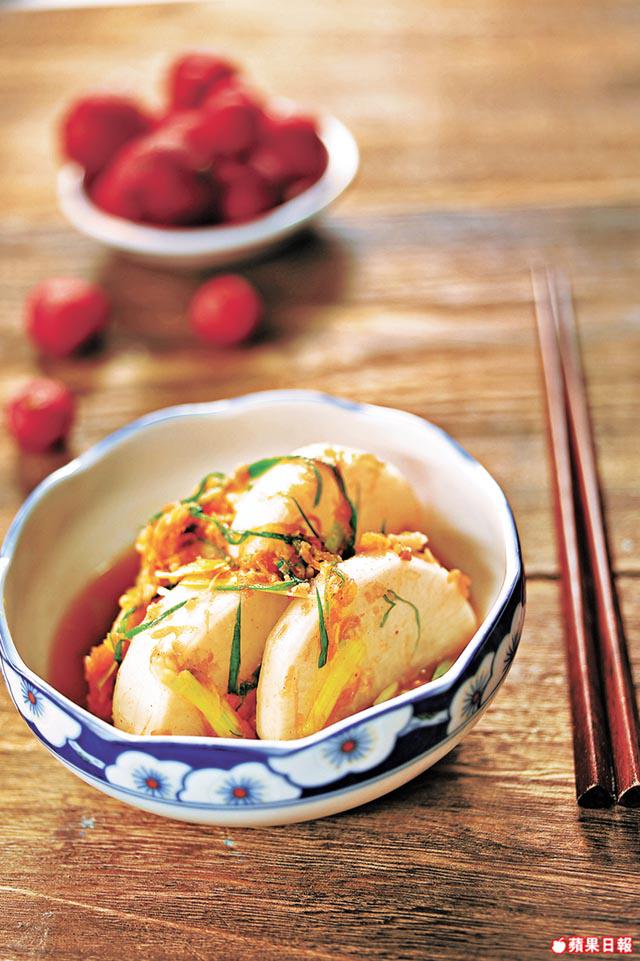 蘿蔔加鹽醃1小時,冲水後瀝乾,與葱絲、大蒜絲、甘笋茸、芹菜片、糖、辣椒醬、魚露、蒜茸及薑茸放入玻璃碗拌勻,冚上保鮮紙,放入雪櫃醃1至2日即可。