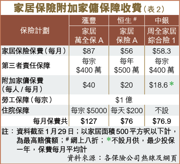 若涉及第三者責任問題,如家傭抹窗導致物件或鋁窗墜下擊傷途人,勞工保險未能為聘請家庭作出保障,但家居保險中第三者責任則可以覆蓋。綜合三間銀行的家居保險基本計劃,滙豐及中銀的第三者責任賠償額每宗400萬元,恒生每年500萬元,並可附加家傭保障,每宗事故賠償額最高1億元(表2)。