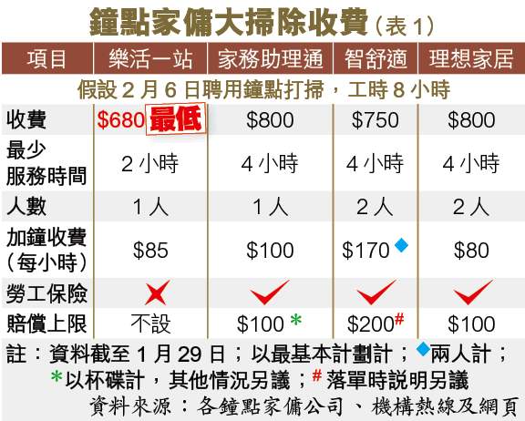 假設本周六(2月6日)聘用家傭打掃,工時8小時計,以僱員再培訓局免費為家傭及僱主提供的中介平台「樂活一站」,每小時85元收費最低,共680元。「家務助理通」及「理想家居」收費較高,各要800元,較樂活一站多120元或17.6%(表1)。