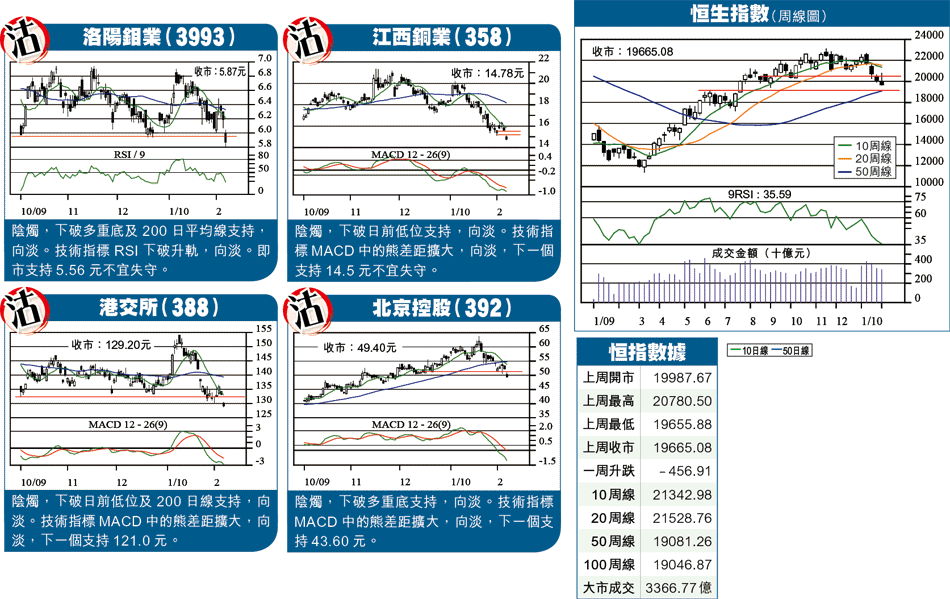 港股上周走勢反覆,周初大幅反彈,直逼21000關口,最高見20780,可惜美股急挫,恒指升幅不但全數報銷,更是創去年9月以來低位,終於收在20000心理關口及200日線(20164)支持之下。恒指全周跌456點或2.3%,收報19665;H指跌幅更達3.2%,或367點,收報11131。展望今周,震盪尋底之勢未改,惟港股進入價值區,追沽的風險較低吸的為高。