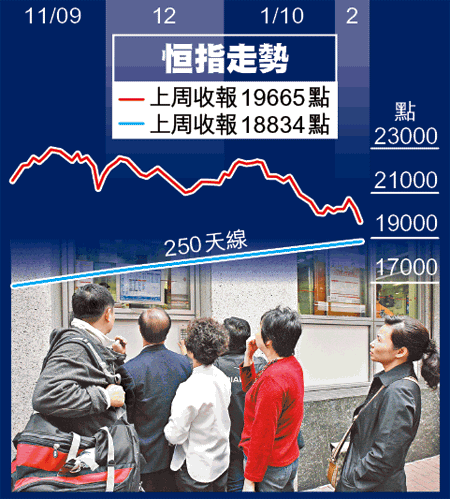 不過,歐洲國家債務危機會未消散,中央加息、退市陰霾仍困擾大市,料港股反彈後會再試低位,250天移動平均線(18800點)水平才是關鍵支持。海通證券(香港)投資諮詢部副總裁郭家耀稱,大市技術走勢轉差,恒指見250天線機會甚高。永豐金融集團研究部主管涂國彬認為,內地通脹壓力越來越大,加深市場對內地加息憂慮,港股中期調整形勢短期難以扭轉。