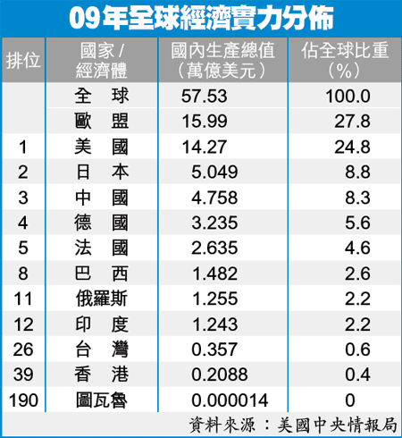 【本報訊】09年全球經濟受金融海嘯冲擊下,據美國中央情報局統計,全球國內生產總值(GDP)較08年下跌5.8%至57.53萬億美元,中國在全球排位保持第3位,經濟規模則上升8.1%至4.758萬億美元,而在全球經濟的佔比則由7.2%增至8.3%。