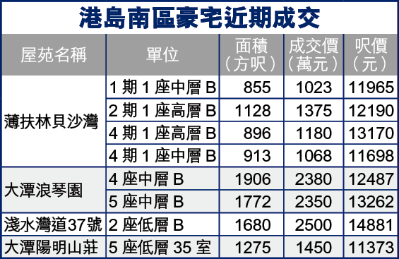 近期南區洋房造價持續上升,焦點項目每方呎造價早已突破3萬元水平,相比之下,分層豪宅造價明顯低水。中原高級分區聯席董事李蓮玉表示,南區數個豪宅屋苑,現時二手呎價仍徘徊1萬至1.4萬元,名氣較大的陽明山莊及紅山半島,呎價1萬至1.1萬元已有「交易」。如紅山半島2座高層B室,1401方呎,享全海景,目前以1550萬元放售,呎價1.1萬元。