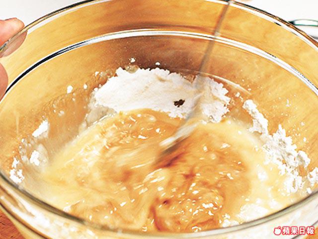 1.麪粉,泡打粉及梳打粉拌勻。