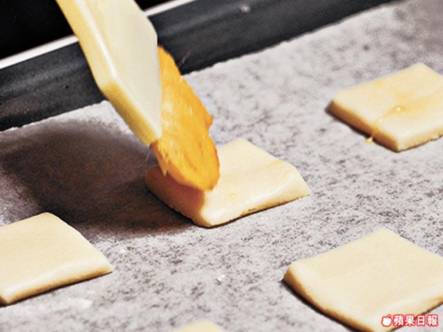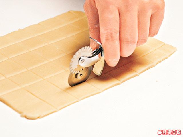 3.將麪糰壓平至筷子厚度,修齊邊,切出所需大小,放在已鋪上牛油紙的焗盤中。