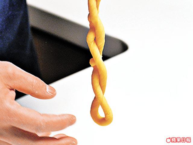 4.將粉糰分成每個約25克的小糰,再搓成細長條,固定一邊,另一邊向後推搓成扭紋,然後拿起兩端,便會自轉成麻繩狀。