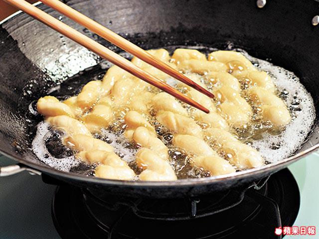 5.用中火將油加熱至150℃,放入麻花卷轉細火炸至浮起,勿用大火,否則外硬內不脆,瀝乾油即成。