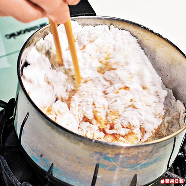 2.另煲滾大約1碗水,放入片糖煮溶,然後將(1)分成小粒放入糖水中一起煮熟,然後熄火,再倒入150克糯米粉,拌勻後倒上枱,繼續搓勻成軟身粉糰,逐少加入剩餘的糯米粉搓勻至滑身。