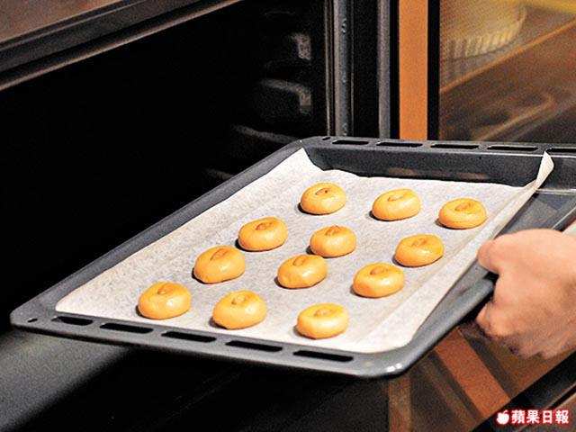 3.將麪糰分成小球搓圓,放上已鋪有牛油紙的焗盤,略為壓平。