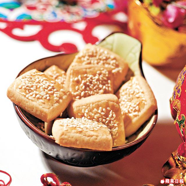糖110克、固體菜油120克、低筋麪粉220克、泡打粉2克、蛋/蛋白各1隻、奶粉5克、芝麻50克、鹽少許、梳打粉1/4茶匙