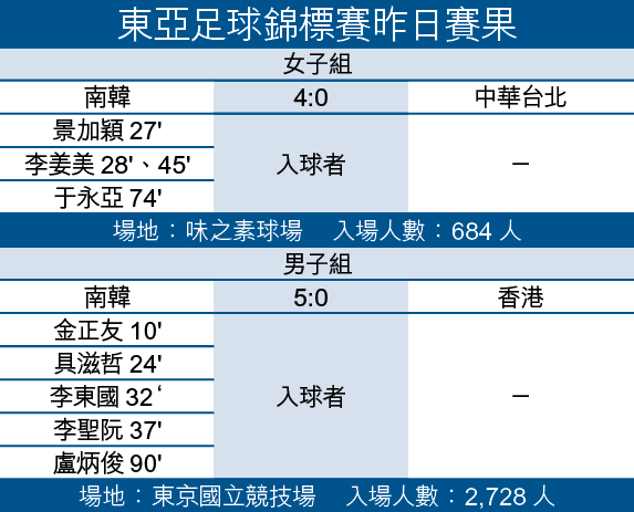 面對世界級強敵,挾東亞運金牌餘威的香港足球代表隊終上了寶貴一課!港隊昨晚在東京國立競技場舉行的東亞足球錦標賽,防線踢來千瘡百孔,終被「太極虎」南韓徹底擊潰,大敗0:5而回。港隊領隊羅傑承賽後將大敗歸咎寒冷天氣,以及防守上的連番失誤。