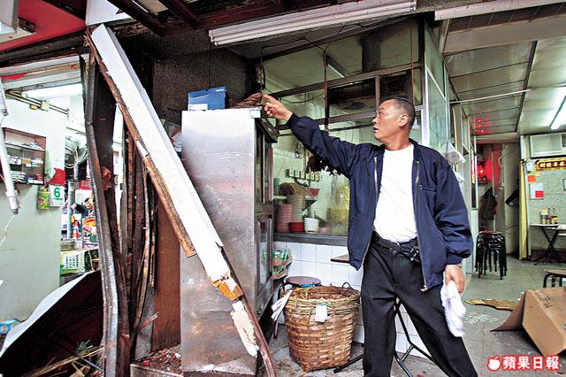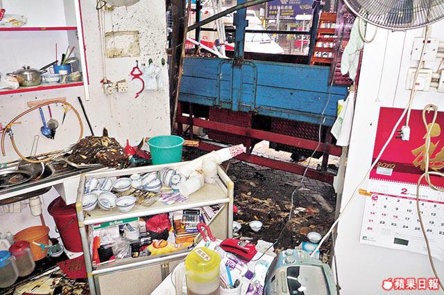 目擊者指出,貨車衝上行人路期間撞毀兩支道路指示牌、交通燈及紅色水龍頭,再撞毀一條街燈柱,其中兩支路牌及水龍頭被壓在車底,燈柱則被撞至傾側,燈罩跌在路中。凉茶舖及麪店門口的工具和廣告板被撞至支離破碎,散落行人路上。其中凉茶舖的一碗碗凉茶亦傾瀉地上,店內一片凌亂。部份損毀木板與雜物則飛入麪店,現場遍佈木碎及雜物,滿目瘡痍。