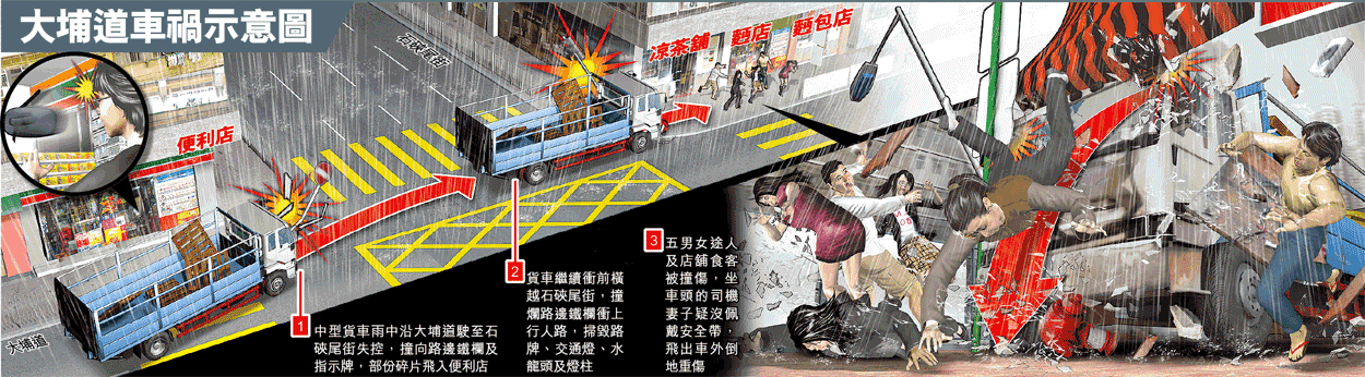 【本報訊】深水埗大埔道昨日下午發生嚴重車禍,一輛中型貨車疑天雨下腳掣失靈,失控撞毀路邊鐵欄及衝上行人路,如打保齡般將五名男女途人及食客撞倒。司機妻子懷疑沒有佩戴安全帶,從車頭擋風玻璃跌出車外重傷昏迷,司機則一度被困駕駛室,痛苦呼救。警方及消防員趕至將司機救出,他與其餘六名傷者分別被送往兩間醫院。